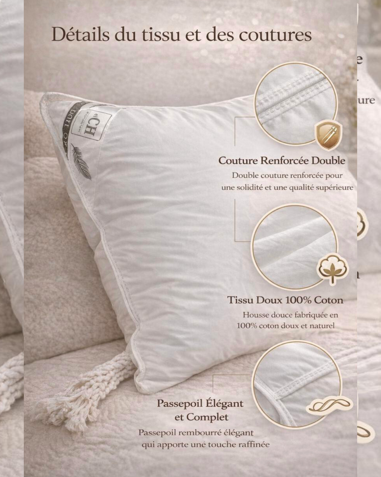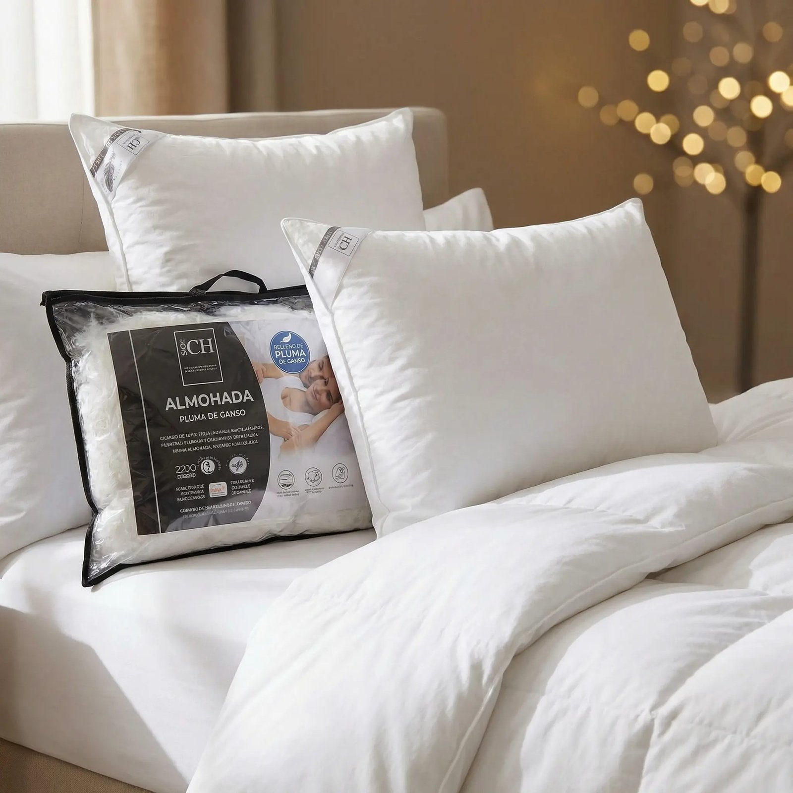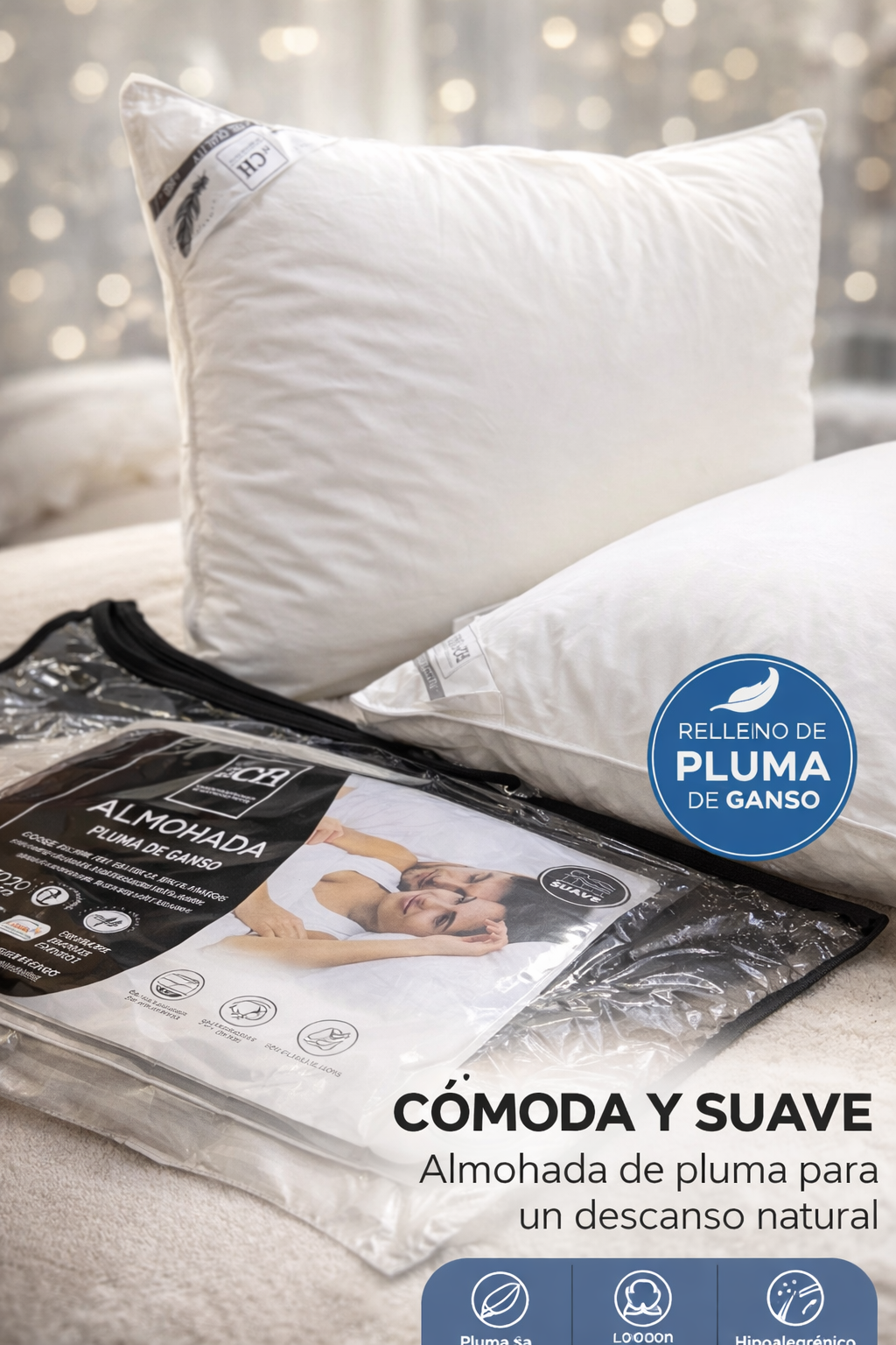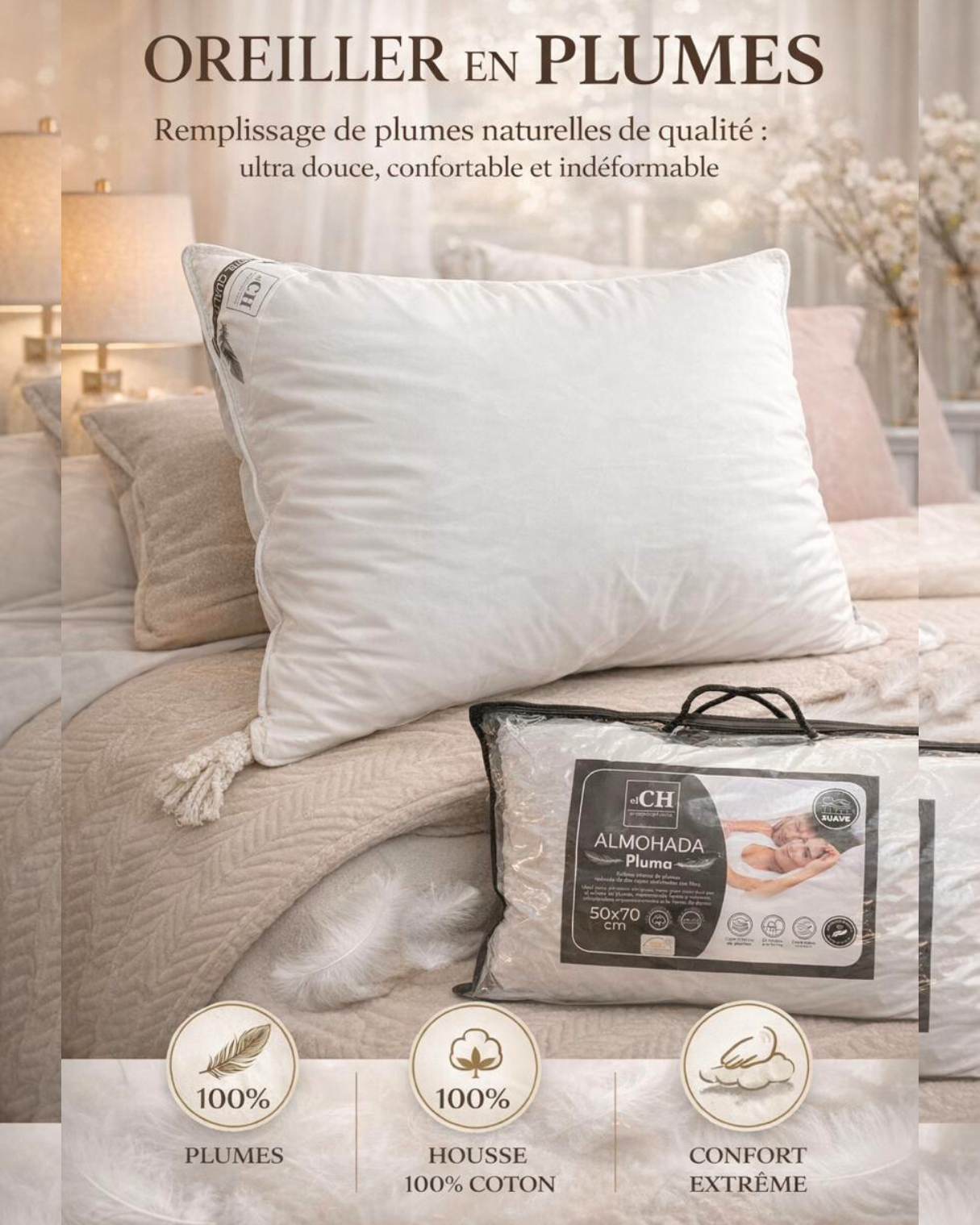 Dûvet d’hotêl pour votre maison. Oreiller garni de plumes naturel et recouvert de coton percal 200TC pour une douceur et un confort incomparables, Hypoallergénique. Poids 1500g